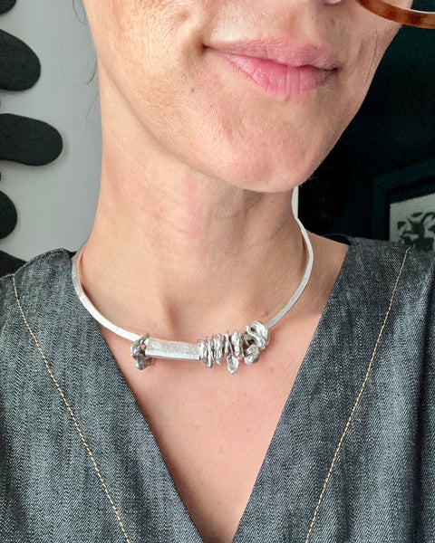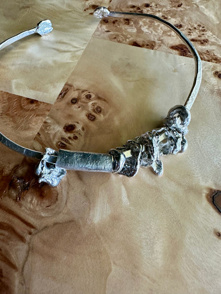 This collar was completely handmade with sterling silver. It is the slightly smaller version of the two listed with a thick sterling silver wire that I textured and shaped. The charms are made through a process called water casting. I melt sterling silver into water and these organic shapes are created. I melt a hole in the center of each charm before adding them to the collar. You can mold the collar to fit your neck comfortably and then carefully slip it on and off.