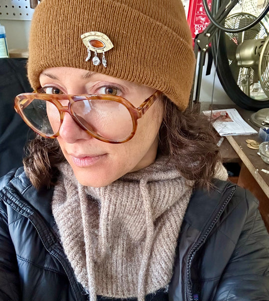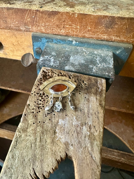 This eye pin was handmade with sterling silver, brass and a kyanite stone. I set the stone in silver and on a hand cut and textured brass eye. There are water cast silver charms hanging down. The component on the back is also handmade by me!