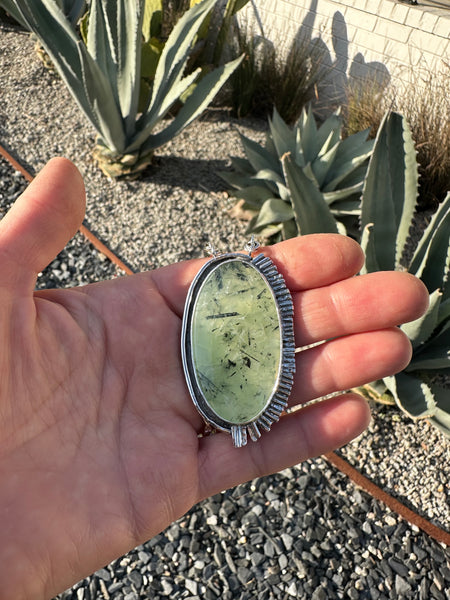 This beauty was handmade with sterling silver and a gorgeous prehnite stone. I set the stone in sterling silver and added textured accents. The chain is completely handmade with hammered sterling silver wire and handmade sterling silver jump rings. It is finished with a handmade sterling silver clasp.