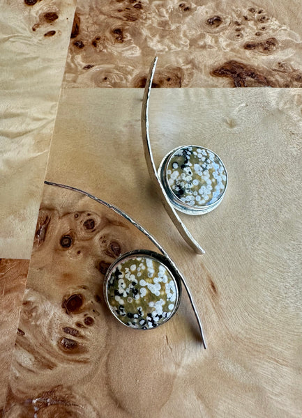This pair was handmade with sterling silver and oolite jasper. I set the jasper in silver and then added the curved, textured sterling silver pieces. They are finished with sterling silver posts and sturdy rubber backs. Top of your look with this cool pair.