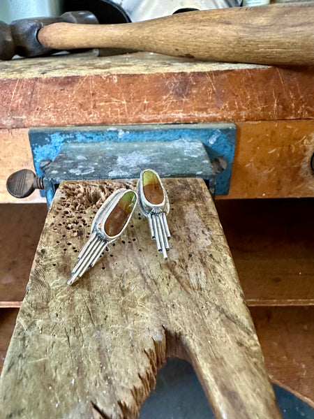 These earrings were handmade with a pair of turquoise stones and sterling silver. I set the stones in silver and then added some hammered sterling accents. They are finished with sterling silver posts and sturdy rubber backs.