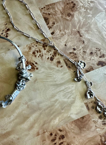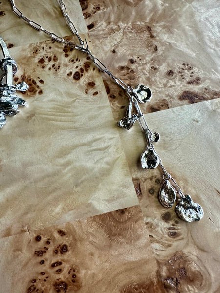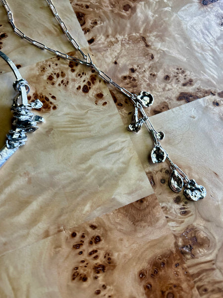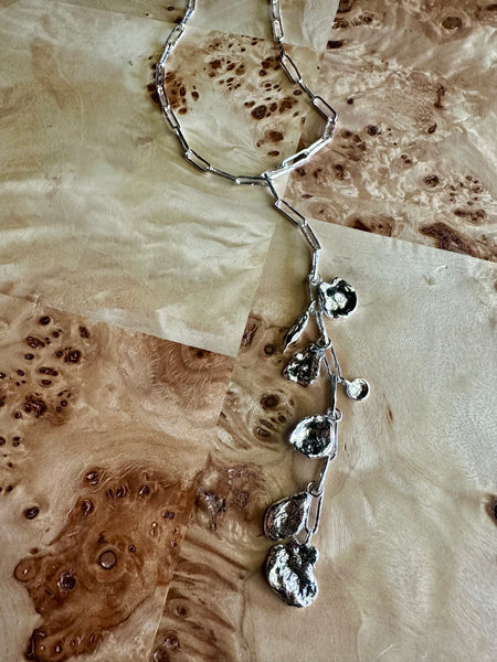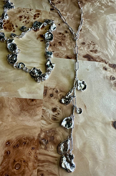 This necklace is completely handmade with sterling silver. I create each link by cutting, hammering and shaping sterling silver wire. Every link is joined and soldered closed. The charms are created through a process called water casting. I melt silver into water to create these unique organic shapes. The sterling silver clasp allows you to adjust the necklace as you desire.