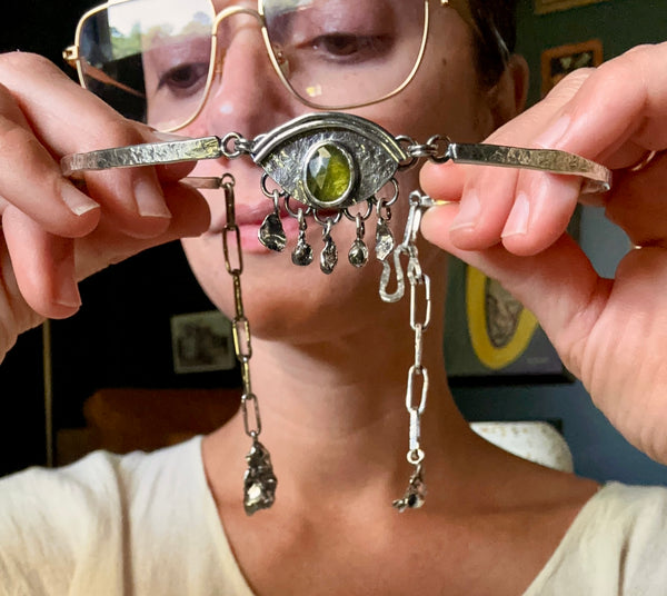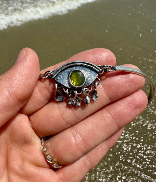 The sterling silver water cast charms at the bottom of the eye and on both ends represent transformation and strength.