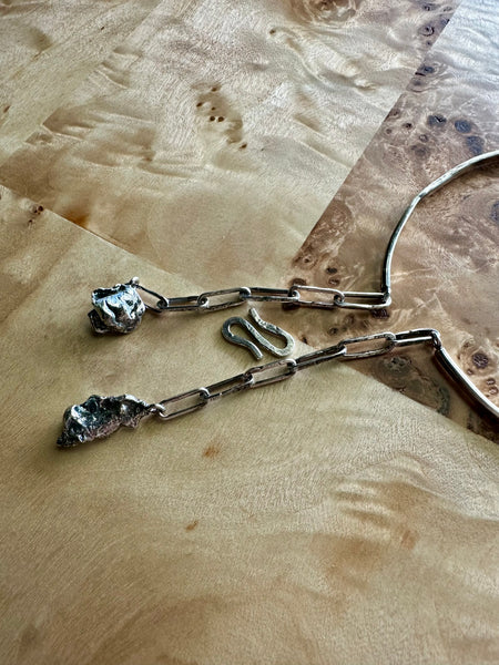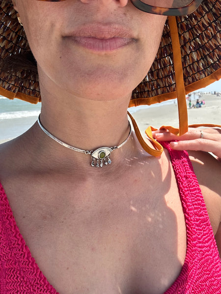 This beauty was handmade with a rose cut vesuvianite stone and sterling silver. Every piece is hand cut and textured. The choker is made with handmade sterling silver chain, so it is adjustable. The sterling silver clasp attaches on both sides making the choker as big as 17” and as small as 12”