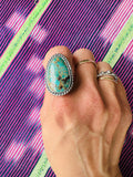 This ring was handmade with turquoise and sterling silver. I set the turquoise in silver and then added a sterling silver twisted wire border. The band is a hammered sterling silver.