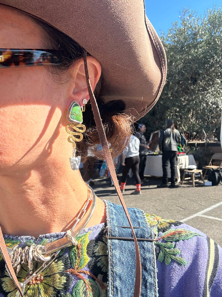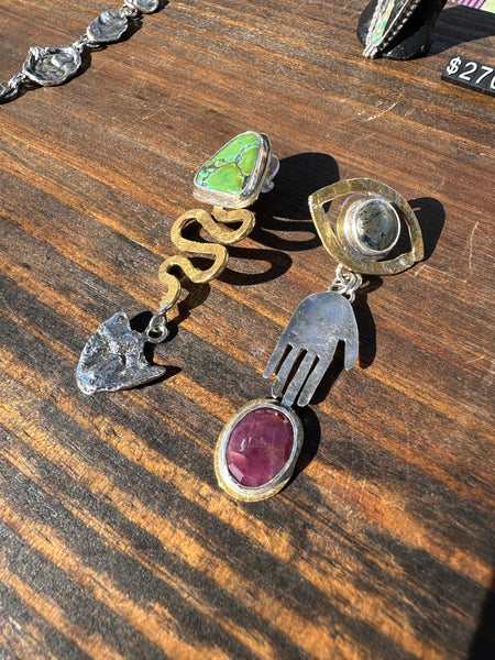 This mismatch pair was handmade with sterling silver, brass, turquoise, pyrite and a rose cut ruby sapphire. Every piece is hand cut and textured. They are finished with sterling silver posts and rubber backs. Oxidized for a vintage vibe + light!